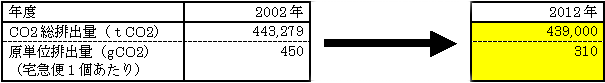 | ヤマト運輸は2012年度も企業として成長を維持しながら、CO2排出量総量を2002年度比で99%に抑制します。そのために、原単位排出量(宅急便1個あたり)のCO2排出量を、30%削減します。 |