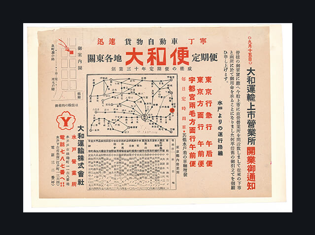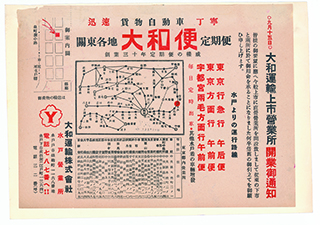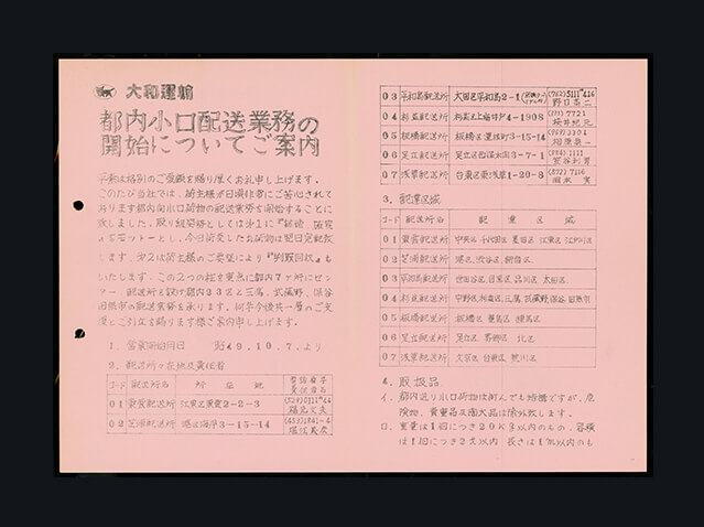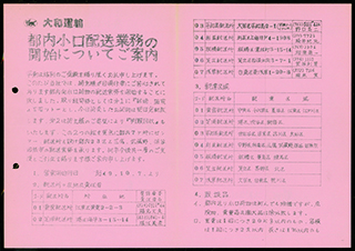 1974年9月_小口配送業務の案内チラシ。百貨店の配送所を拠点とした運行計画図も掲載(表)
