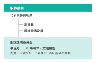 ヤマトグループでは、取締役会の監督のもと、環境委員会を意思決定機関とした環境マネジメント体制をもち、気候変動を含む環境課題の審議・決定・監督を行っています。代表取締役社長が環境委員会の委員長を務め、環境マネジメントの統括責任者として環境委員会で審議された重要事項を経営会議および取締役会に報告します。例えば、気候への緩和や適応を含む環境方針は環境委員会で承認を受け、経営会議および取締役会で決議されています。また、マテリアリティの特定やビジョン、GHG排出量削減を含む長期目標、環境中期計画(目標・戦略)などが経営会議および取締役会で審議されています。