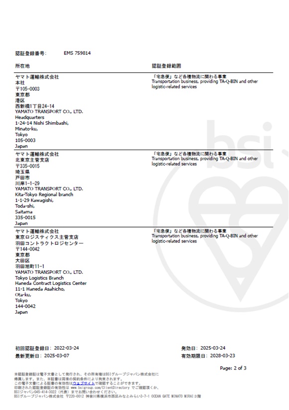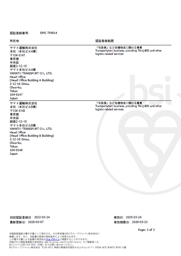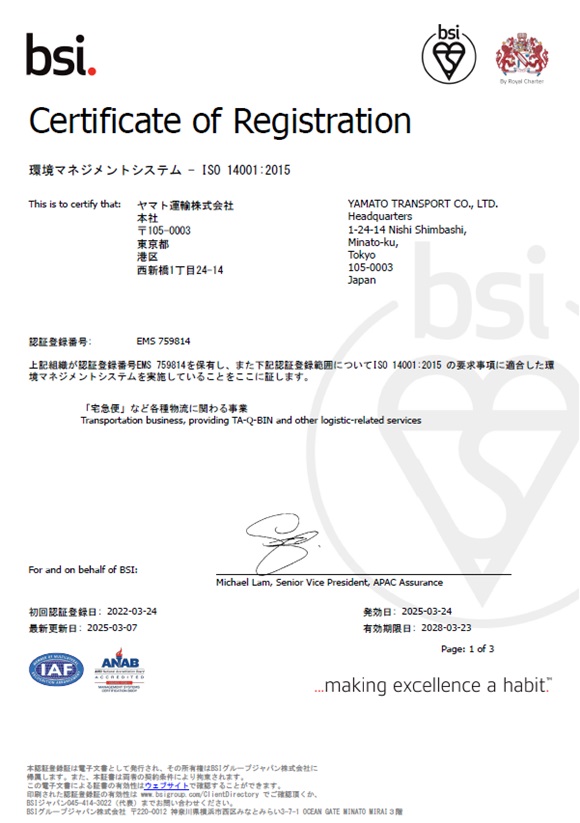 ヤマト運輸(株)では、すべての事業所においてISO14001の基準に沿った環境マネジメントシステムを導入し、事業活動におけるエネルギーや大気汚染物質、資源、廃棄物、水などの環境側面を特定し、環境影響の大きい項目については目標を設定して取り組んでいます。全社に展開している環境マネジメントシステムが有効であることを裏付けるため、一部の事業所でISO14001の認証を取得しています。