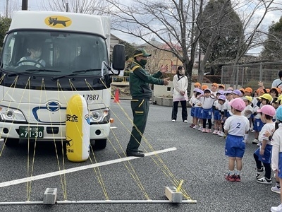 セールスドライバーを中心とした社員が地域の保育園・幼稚園・小学校などに出向き、交通安全について分かりやすく指導します。特に集配車両の乗車体験は、車両の内部を見学するとともに運転席に座って死角を確認するという内容で、普段はできない体験に子どもたちだけでなく保護者や先生方からもご好評をいただいています。