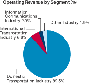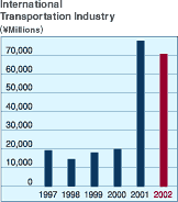 putting pressure on operating margins. The Yamato Transport Group delivered solid business results in the fiscal year under review as it established a new corporate logistics division to increase competitiveness in the corporate market and streamline operations in all businesses. We also developed a new Internet-based home delivery service. Total parcels handled by TA-Q-BIN grew 5.5% to 947 million units. Collect Service showed favorable results, with the total number of parcels handled growing 10.1% over the previous fiscal year to 52 million units. We enhanced the system usability of our home moving centers and established more of them, thus growing the number of moving service orders we received. We introduced software that prints out destination address labels in our Kuroneko Mail business, thus boosting the total number of parcels handled by that service and turning in positive business results for the fiscal year. However, changes in freight handling procedure at airports resulting from last years terrorist attacks caused a drag on our domestic air cargo business, which underperformed compared to the previous fiscal year. Altogether, operating revenues for our domestic transportation business totaled ¥834,418 million (US$6,273.8 million), an increase of 4.0% over the previous fiscal year. |