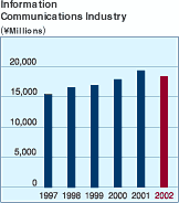 ![]() In the information communications industry, there has been growth in services such as Internet data centers (IDCs), which maintain and operate the servers of companies conducting business on the Internet. In this environment, we introduced a comprehensive monitoring system designed to strengthen IDC facilities and enhance their use. At the same time, we have begun developing the new business of offering seminars to educate and support e-business ventures. Primarily due to the transfer of operations of our logistics center, however, operating revenues of our information communications segment were down 5.1% from the previous fiscal year to ¥18,431 million (US$138.6 million). |