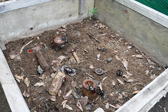 生き物が暮らす「ビオトープ」で、池に住む生き物や、カブトムシの観察をしました。