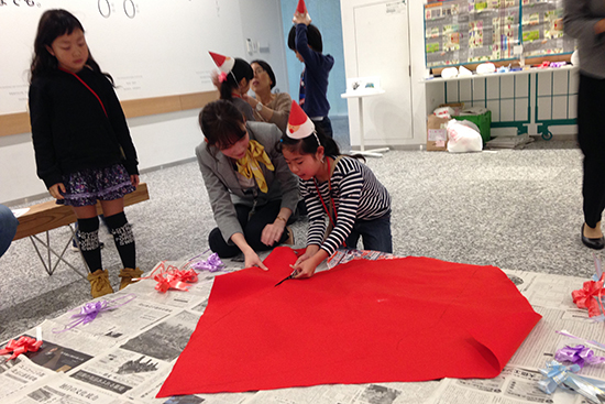 保護者の方も見守りながら、ハサミで巨大帽子を作りあげていきます