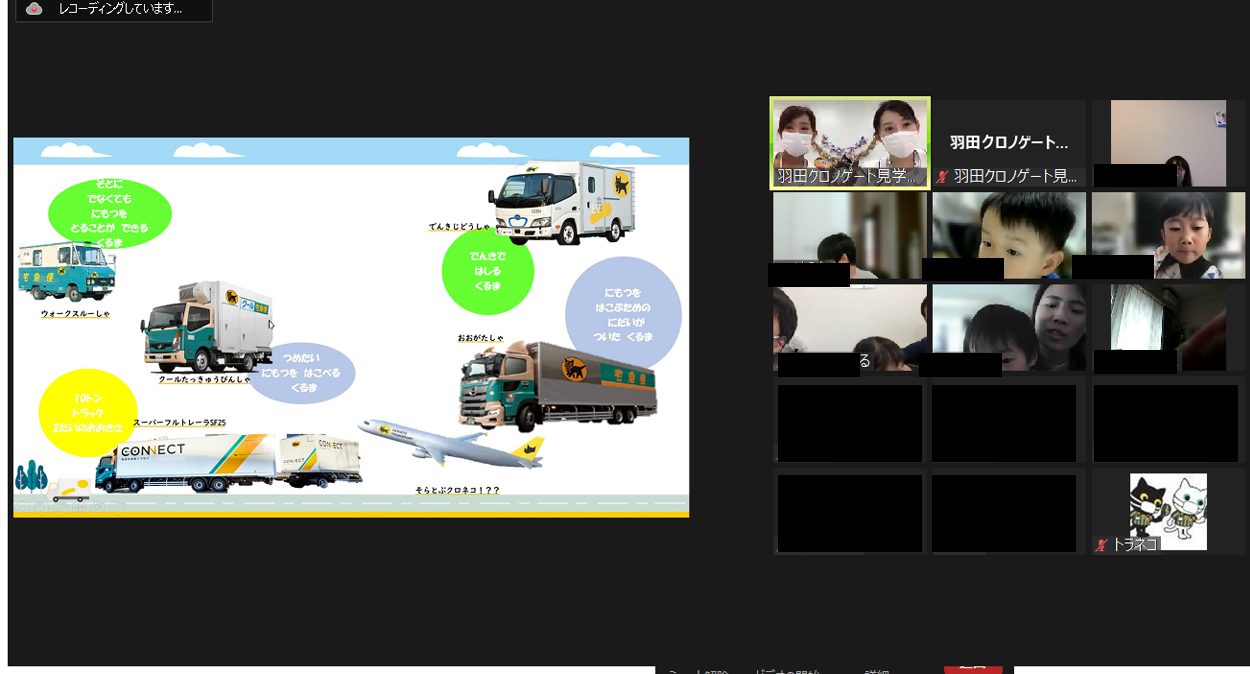 「荷物のしわけの仕組み」と「クロネコヤマトののりもの」など、映像やクイズを交えながらご案内しました。イベントのあとは実際に羽田クロノゲートでしわけをした荷物をご自宅へ宅急便でお届けしました♪
