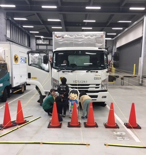 通常の見学コースで紹介している「荷物の仕分けの仕組み」に加えて、交通安全教室も開催。普段は従業員しか入れない物流棟の中で正しい横断歩道の渡り方やトラックの乗車体験を行いました。運転席からはみえない場所、「死角」についても体感しながら学んでくれました!