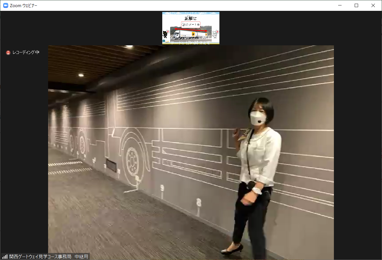 | 見学コースからの中継も行いました♪ 「スーパーフルトレーラSF25」を実物大で壁面に 描いたイラストをご紹介! |