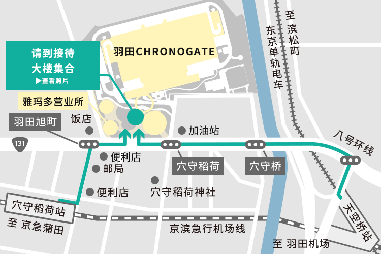 出站左转,抵达八号环线后过右手边的羽田旭町的马路,再右转走50米,左手边就是接待大楼。