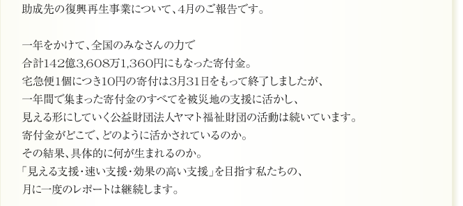 国の補助はつきませんでした。ヤマト福祉財団では、復興に向けた地域就労環境を