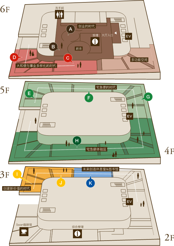 介绍创业之地银座的变迁,以及创业后不久时公司的情况。除了可以一窥车辆和制服等当时的事业活动的展览以外,还能够感受到一直传承至今的创业者小仓康臣作为经营者的原点。