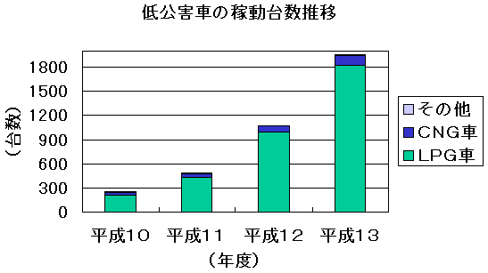 | (1) | LPG・CNG燃料供給施設のない地域については、その時点での最新規制適合ディーゼル車を毎年2000台〜2500台の規模で代替え・新規導入しています。 |
