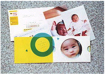 可愛いフォトフレームタイプのマウント(台紙)に入ったはがきサイズの写真(3枚まで)・年始の挨拶が入ったデザインシート・ご依頼主様のアドレスカードをセットにしてヤマト運輸がお届けします。