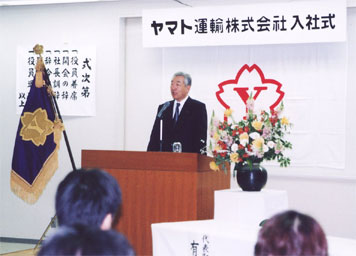 宅急便を始めて27年。猛烈に成長しましたが、今から40年後宅急便が成長しているとは限りません。そろそろ成熟の時期を迎え、競争も激しくなります。今日から日本郵政公社が発足します。大きなライバルが目を覚ましました。我々も問題意識をもって前向きに取り組んでまいります。皆さんも面白い時期に入社したと思います。 |
