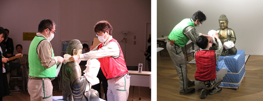 1チーム2名(計9チーム)で、仏坐像の養生梱包を想定した審査を行いました。作品所有者から見て