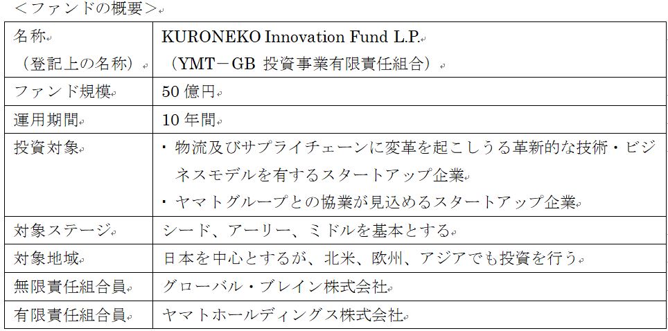 ヤマトホールディングス株式会社(本社:東京都中央区 代表取締役社長:長尾 裕 以下:YHD)は、独立系ベンチャーキャピタル大手のグローバル・ブレイン株式会社(本社:東京都渋谷区 代表取締役社長:百合本 安彦)と共同で、コーポレートベンチャーキャピタルファンド(CVCファンド)「KURONEKO Innovation Fund」を、4月1日に設立いたしますので、お知らせいたします。