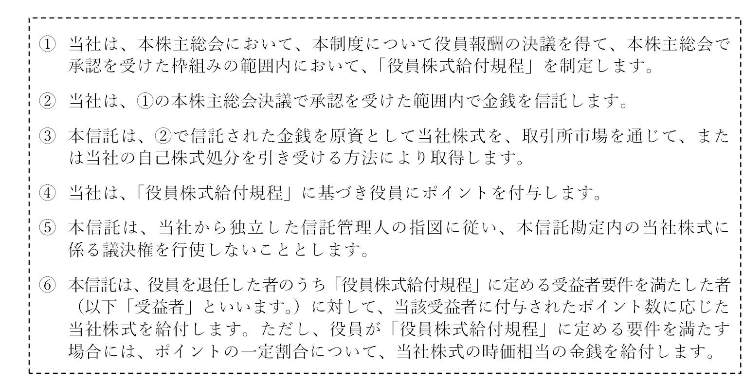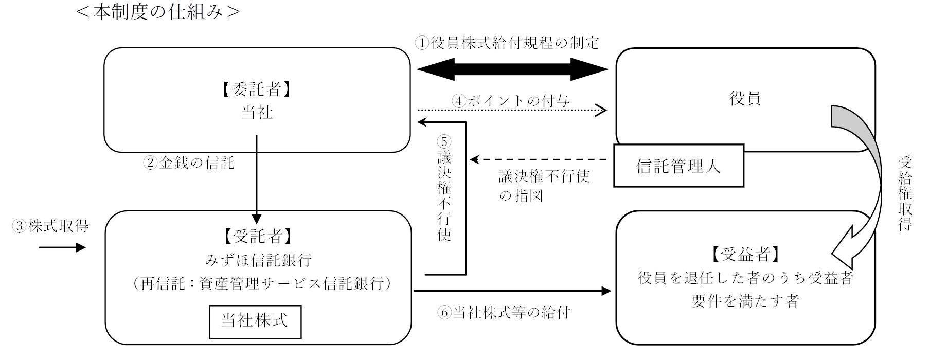 本制度は、当社が拠出する金銭を原資として当社株式が信託(以下「本信託」)を通じて取得され、役員に対し当社が定める役員株式給付規程に従って、当社株式および当社株式を時価で換算した金額相当の金銭(以下「当社株式等」)が本信託を通じて給付される「業績連動型株式報酬制度」であります。なお、役員が当社株式等の給付を受ける時期は、原則として役員の退任時となります。