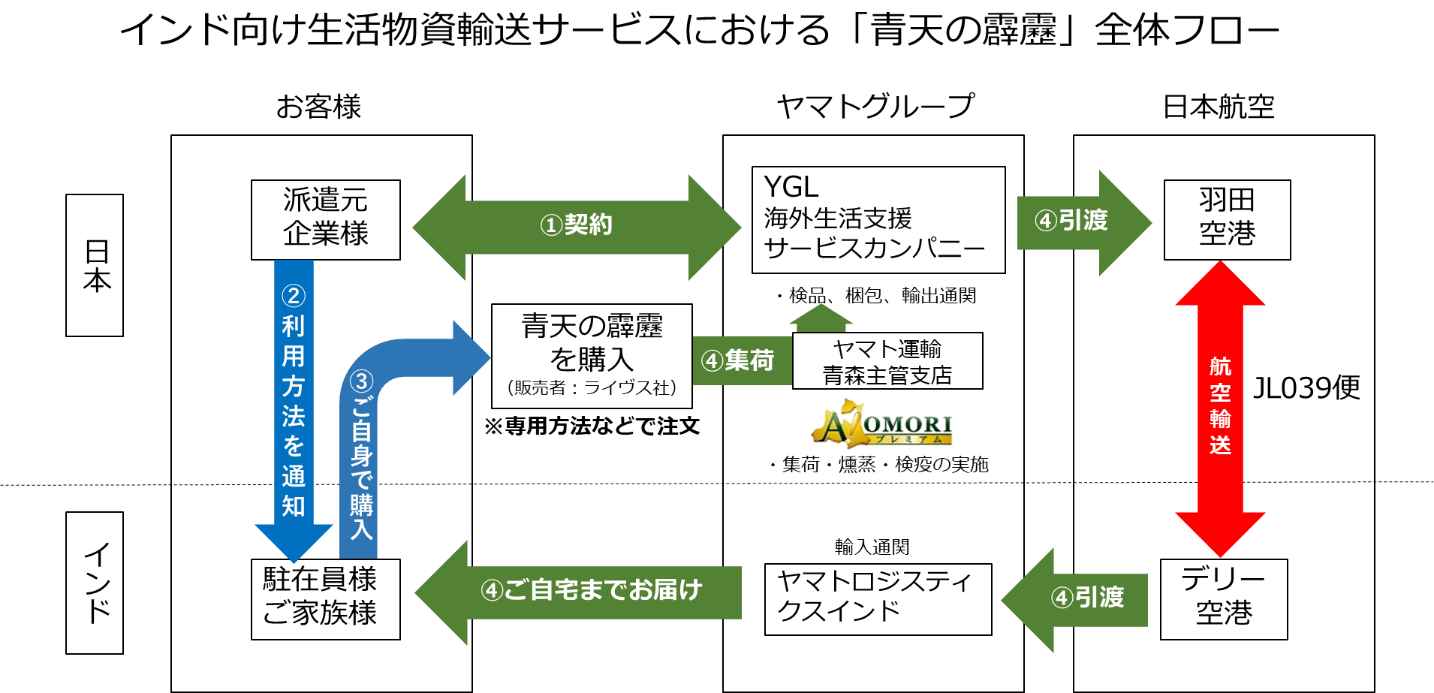 インドでは多くの企業が活動を再開し、一時的に日本に帰国していた駐在員も再度赴任し始めていますが、新型コロナウイルス感染症拡大の影響で、日本からの生活物資の取り寄せは引き続き困難な状況が続いています。こうした背景もあり、両社が昨年9月より開始した在インド駐在員の皆さまとそのご家族への食材や衣料品の輸送サービス※1は大変好評で、既に多くの企業・団体にご利用いただいています。一方で、「取り寄せたい」というご要望の多い日本産の精米については、通関規制などにより取り扱いが難しい状況でした。そこで、この度、青森県が提供する総合輸出プラットホーム「A! Premium」※2を活用し、精米の輸送に必要な全ての手続きを一元的に行う仕組みを構築したことで、安定的に日本産の精米を取り寄せることができる輸送サービスを実現しました。