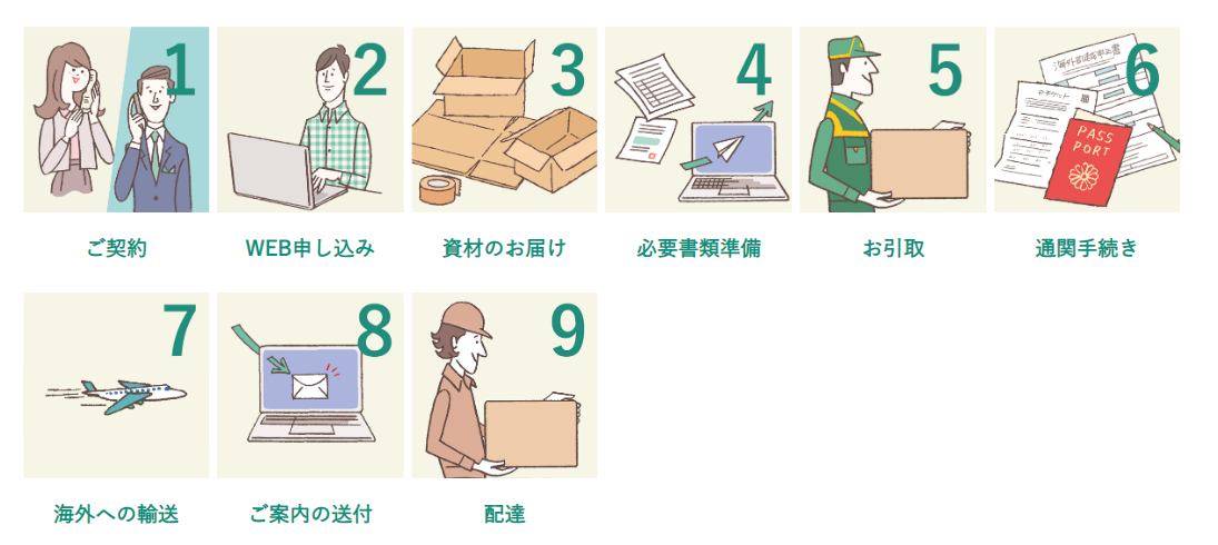 当社と法人契約を結んだ企業の社員の方を対象とした米国向け単身赴任引越サービスで、お申込み手続きや集荷、現地での受取りまでをWEBのみで完結することが可能です。専用WEBサイト※1からのお申込みや梱包資材の手配、荷物の梱包は社員の方ご自身で対応いただき、弊社スタッフは集荷のみを行います。また、米国国内の配送はパートナー会社にて行います。※1 専用WEBサイトURL http://www.y-logi.com/service/kaigai/houjin/tanshinbiz/index.html