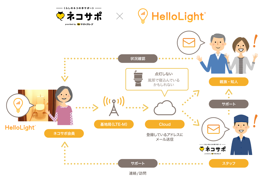 ネコサポ会員の宅内に設置したIoT電球「HelloLight」が一定時間ON/OFFしない場合、この電球が自律的にネコサポ会員の指定した親族や知人、そしてヤマト運輸ネコサポステーションに異常検知のメールを発信します。