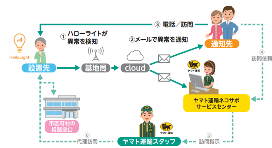 サービスの利用を希望する設置先(例:高齢者)の宅内にヤマト運輸がIoT電球「HelloLight」を設置します。宅内に設置した電球が一定時間ON/OFFしない場合、利用者が指定した通知先(例:親族や知人)、ヤマト運輸のネコサポサービスセンターへ自動的に異常検知のメールが発信されます。
