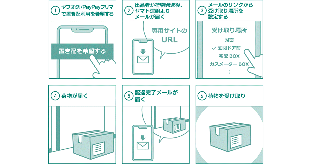 出品者が「ヤフネコ!パック」での発送を選択し、さらに購入者が商品購入後(PayPayフリマは購入時)のお届け先住所の入力時に「置き配利用」を選択した場合、「対面」での受け取りに加え、「玄関ドア前」、「自宅宅配BOX」、「ガスメーターBOX」、「物置」、「車庫」、「自転車のかご」、「建物内受付/管理人預け」など、希望する場所での受け取りが可能となります。