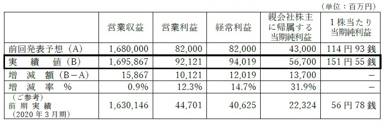 その結果、営業利益については前回発表予想を101億円、経常利益については前回発表予想を120億円、親会社株主に帰属する当期純利益については、前回発表予想を137億円上回りました。