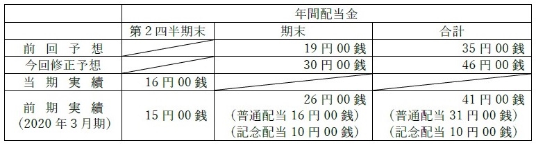 2021年3月期の配当予想については、2021年3月期通期連結累計期間の実績値が前回発表予想を上回ったことを踏まえ、期末配当金(普通配当)の予想を前回予想から11円増額の30円に修正いたします。これにより、年間配当金は、中間配当金16円と合わせて46円となる予定です。
