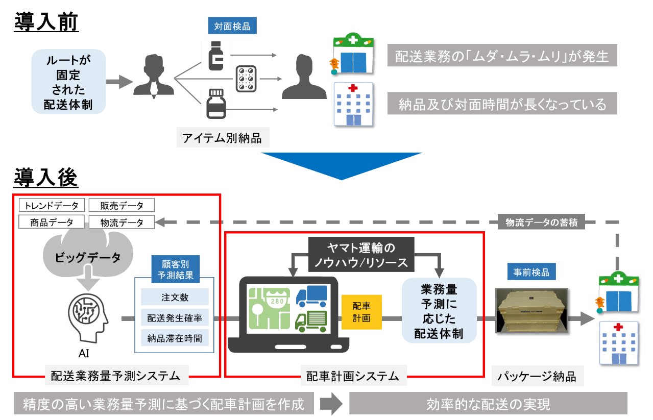アルフレッサとヤマト運輸はこれらの課題の解決に向けて、2020年7月に「ヘルスケア商品」の共同配送スキームの構築に向けた業務提携を発表いたしました。第一弾として、ビッグデータとAIを活用して、顧客毎に日々の配送業務量を予測する配送業務量予測システムと適正な配車を行う配車計画システムを開発し、このたび導入を開始いたします。