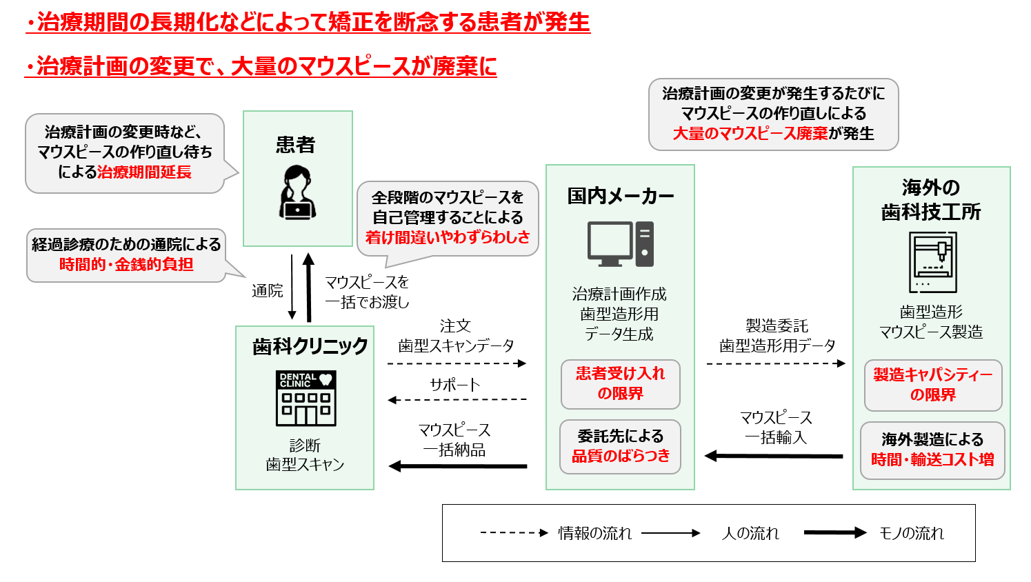 これまでワイヤーが一般的だった歯科矯正ですが、軽中度な場合、透明で周囲から目立ちにくく、ワイヤーと比べ安価なマウスピース矯正が拡大しています。マウスピース矯正は1~2週間ごとにマウスピースを交換し、歯列を少しずつ動かすため、患者さま1人あたり20~30段階の異なる歯型模型が必要となります。またマウスピースは1つ1つ患者さまごとに異なることから大量生産が難しく、人件費が安い海外の歯科技工所で、初期計画をもとに矯正開始から完了までを一括製造し、輸入するスタイルが一般的でした。