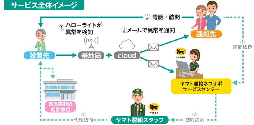 お申し込みいただいたUR賃貸住宅の居住者のご自宅内に当社スタッフがIoT電球「ハローライト」を設置します。ハローライトの点灯/消灯の動きが24時間ない場合、事前に指定した通知先(例:親族や知人)と当社ネコサポサービスセンターに異常検知のお知らせメールが自動配信されます。居住者と連絡が取れない、または遠方などの理由で訪問できない場合、スタッフが居住者のご自宅に代理訪問します。状況に応じて地域包括支援センターなどに通報します。