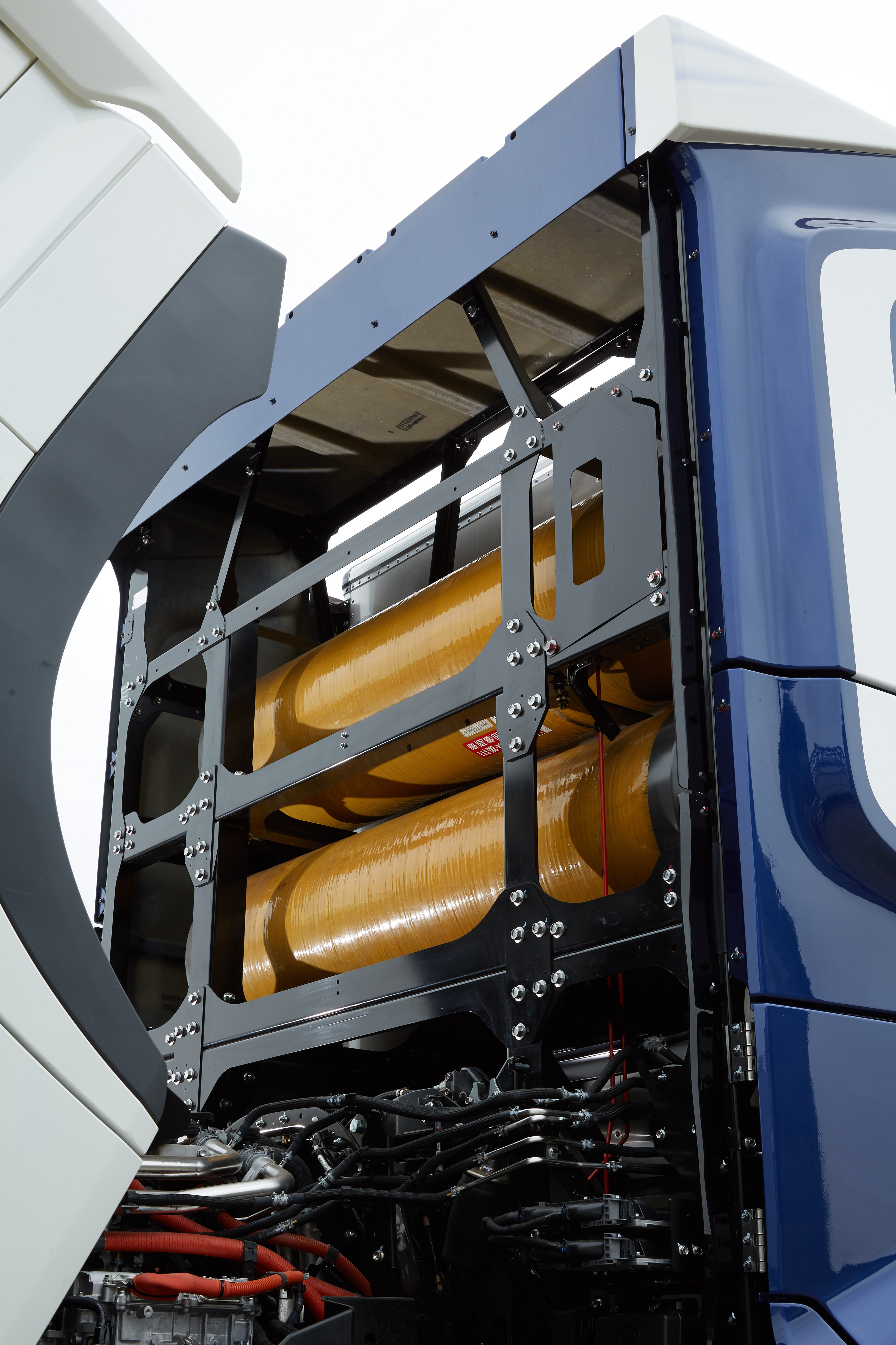 トヨタのFC技術を応用し、大型トラックに最適化したFCスタック※2を2基搭載。さらに、新たに開発した大量の水素を貯蔵可能とする大型高圧水素タンクを6本搭載。貯蔵した水素と大気中の酸素をFCスタックに取り込むことで発電し、その電気でモーターを駆動させることで車両が稼働する。