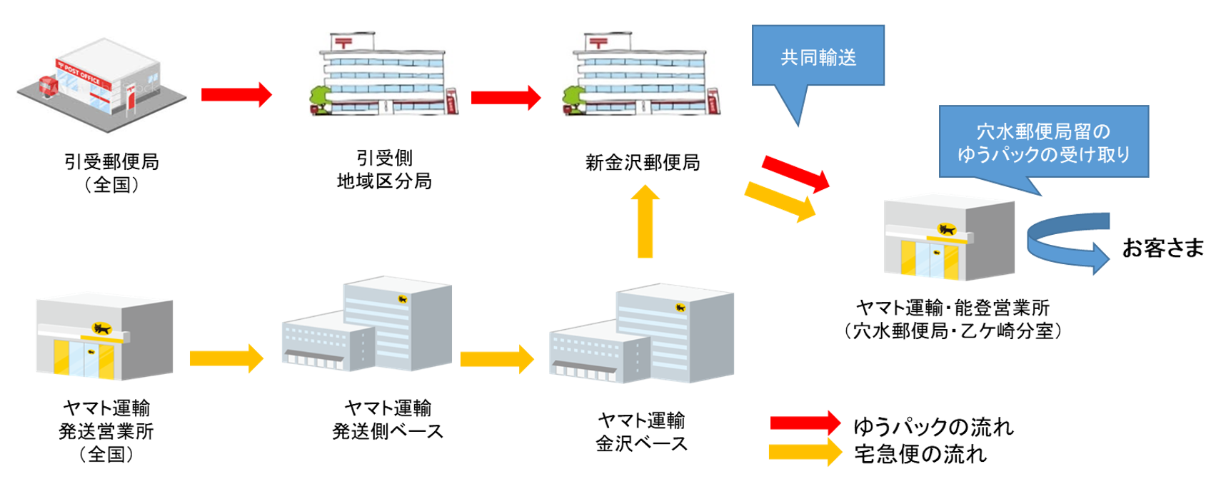 今回の地震により穴水郵便局(石川県鳳珠郡)が大きな被害を受けたことから、日本郵便の荷物の引渡し拠点としてヤマト運輸の能登営業所を共同利用し、同営業所において、局留扱いとして差し出されたゆうパックの引渡しを開始します。また、能登営業所に輸送する両社の荷物を共同輸送することで、効率的な輸送の実現と地域の渋滞解消に貢献します。