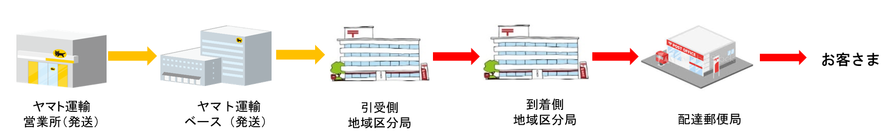 ヤマト運輸がお客さまから「クロネコゆうメール」をお預かりし、日本郵便の引受側地域区分局に差し出し後、日本郵便の配送網でお届け先の郵便受けなどに投函いたします。