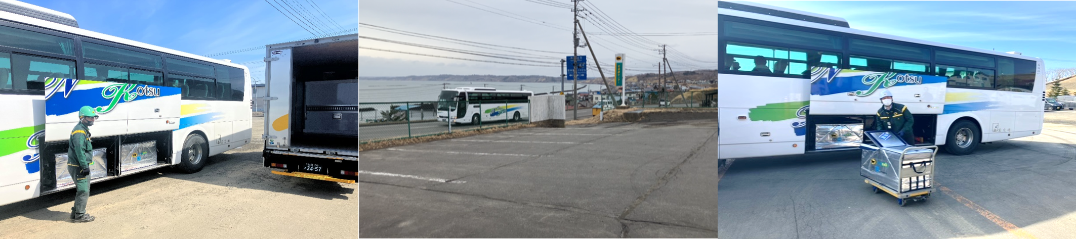 ・バスの大容量トランクルームを貸切利用するため、複数種類(常温・冷蔵・冷凍・お買い物便)のコンテナを効率的に積載可能