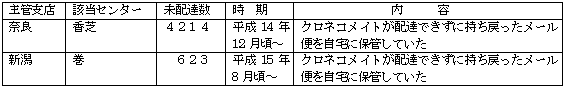 | 平成16年12月4日(土)「クロネコメイトの自宅に配達されず残っているクロネコメール便がある」という指摘を受け確認したところ、奈良主管支店管下で4214冊、新潟主管支店管下で623冊のクロネコメール便が残っているのを確認しました。 |