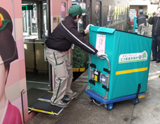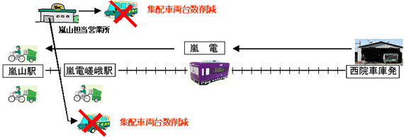 | これまで、京都府久世郡久御山町にある物流ターミナルから嵐山担当営業所へ大型トラックで宅急便を輸送し、そこから2tトラックなどに宅急便を積みかえ配達していました。 今回の取り組みでは、西院車庫から嵐電の車両を1両貸し切り、リヤカーに装着する集配用コンテナを搭載した台車ごと電車に積み込んで宅急便を輸送します。 嵐山駅および嵐電嵯峨駅で台車を降ろし、駅でセールスドライバーが受けとって台車をそのままリヤカー付き電動自転車に積み込みお届けします。 |