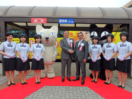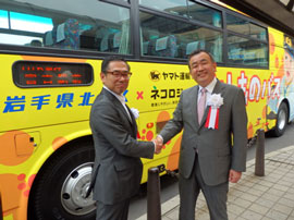 | 新たに開発した「ヒトものバス」の前で握手する松本社長(左・岩手県北バス)と長尾社長(右・ヤマト運輸) | 岩手県北バスのバスガイドとヤマト運輸のキャラクター「シロネコ、クロネコ」に囲まれ握手する長尾社長(中央左)と松本社長(中央右) |