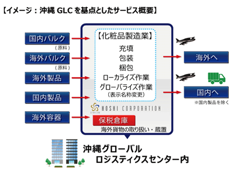 この度、沖縄県那覇市に稼働をした沖縄GLCを活用し、施設内に充填工場を設置することで、「Made in Japan」ブランドの化粧品の原材料の調達から充填・包装、梱包、輸出入も含めた一貫物流を実現し、化粧品メーカー様の海外展開の支援をしてまいります。