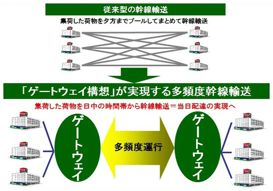 関西GWは仕分け作業の機械化で、省力化・省人化を進め、労働力不足に対応します。また、関西圏のハブとして荷物を集約し、車両台数の削減や積載率向上、走行距離短縮などで輸送効率を高め、コスト構造を改革します。 |