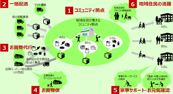 | UR都市機構の多摩ニュータウン団地内にヤマト運輸が2ヶ所の拠点を設け、宅急便の受付だけではなく、宅配ロッカーの設置、お買物代行の注文受付、NPOや団地自治会等との連携、市や地域の情報発信など、居住者が集まるコミュニティ拠点として活用します。 | |