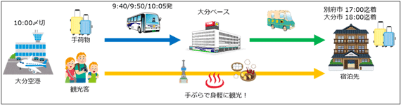 大分交通株式会社(代表取締役社長:杉原 正晴、以下「大分交通」)と大分航空ターミナル株式会社(代表取締役社長:冨高 松雄、以下「大分航空ターミナル」)、ヤマトホールディングス傘下のヤマト運輸株式会社(代表取締役社長:長尾 裕、以下「ヤマト運輸」)は、4月18日(水)より、全国初の観光支援型「客貨混載」を開始します。大分空港から空港リムジンバスが手荷物をヤマト運輸大分ベースへ運ぶことで、別府市内全域と大分市中心地(大分駅周辺)の宿泊施設へ手荷物を当日中にお届けし、インバウンドを含む観光客の早い時間からの身軽な手ぶら観光を実現します。