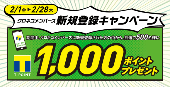 | 内容 | 通常のクロネコメンバーズ新規登録で50ポイント付与に加え、クロネコメンバーズに新規登録者の中から、抽選で500名さまに、Tポイント1,000ポイントをプレゼントします。 |