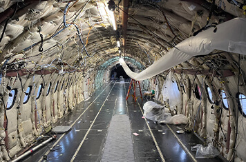 客室内の座席、お手洗い、ギャレー(台所)、天井の荷物入れ、客室内の壁(パネル)やドアなどはすべて取り除き、断熱材などがむき出しになる状態です。