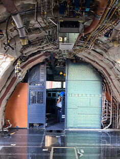 貨物専用機に改修するために必要な機体構造の補強を行うため、操縦室や客室下の貨物室も部品を取り外します。操縦室の前面にあるディスプレイやスイッチ類のついた部品もすべて取り外します。