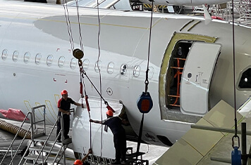取り外した部品やフレイター専用の新しい部品を取り付けて、貨物専用機の仕様にしていきます。メインデッキカーゴには、新たなドアが取り付けられました。