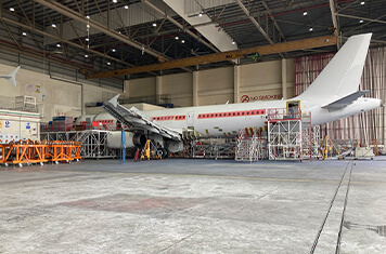 本格的な貨物専用機への改修は、機体構造にかかる負荷を完全に抜いて実施するため、胴体や主翼にジャッキを多数入れて、機体を支えます。