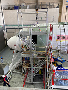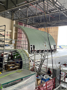 いよいよ、機体構造部分の改修が始まります。これまで客室だった部分はメインデッキカーゴとして貨物を搭載するスペースになるため、フロアビーム(梁)の交換、運航乗務員用ドアの新設、メインデッキカーゴドアの新設、天井エリアの補強、エントリードアの挿入などが行われます。