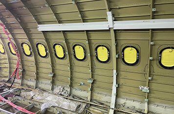 操縦室後方から左側1番ドアのエリアの外板を切り取り、そこに運航乗務員の方が機内に出入りするためのドアを新設します。少しでも多くの貨物を運ぶことができるよう、ドアは小さく、かつ前方に位置します。ドアの周辺構造はすでに製作済みの部品を機体に取り付けます。