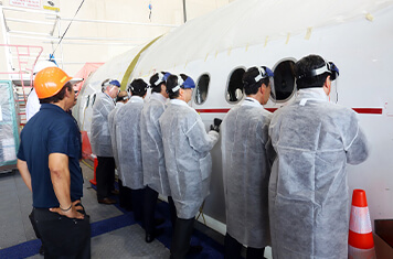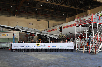 機体に切り込み(カッテイング)を入れます。ここから機体構造を改修する上で重要なフェーズに入り、改修工程の一つの大きな区切りとなります。関係者が一同に介し、無事に改修完了を願うためにセレモニーを行いました。